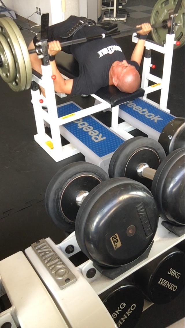 身体を安定させて重りを挙げていくことが大切なので、ベンチ台からいかに身体を前後に移動させずに、動作を行えるかを課題にしております。